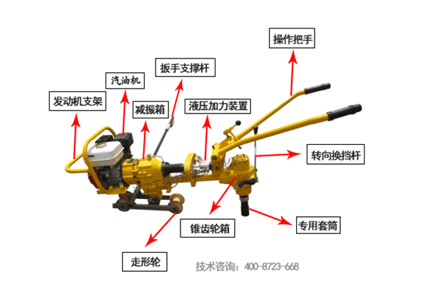 5.操作手柄的無(wú)縫鋼管形成焊接結(jié)構(gòu)。壓下操作手柄可以使套筒與軌枕扣件螺母對(duì)齊,同時(shí)結(jié)合減速機(jī)內(nèi)的錐形摩擦離合器來(lái)擰緊或松開螺母。也可以在道路上上下下和舉升機(jī)器時(shí)使用。